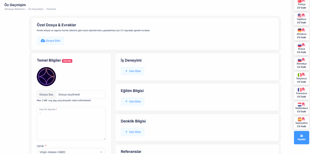 Almanya Rehberin, Europass uyumlu özgeçmişler (CV) oluşturmanız için bir hizmet sunmaktadır. Bu hizmet sayesinde, dünya genelinde iş başvuruları için 9 farklı dilde CV hazırlayabilirsiniz.